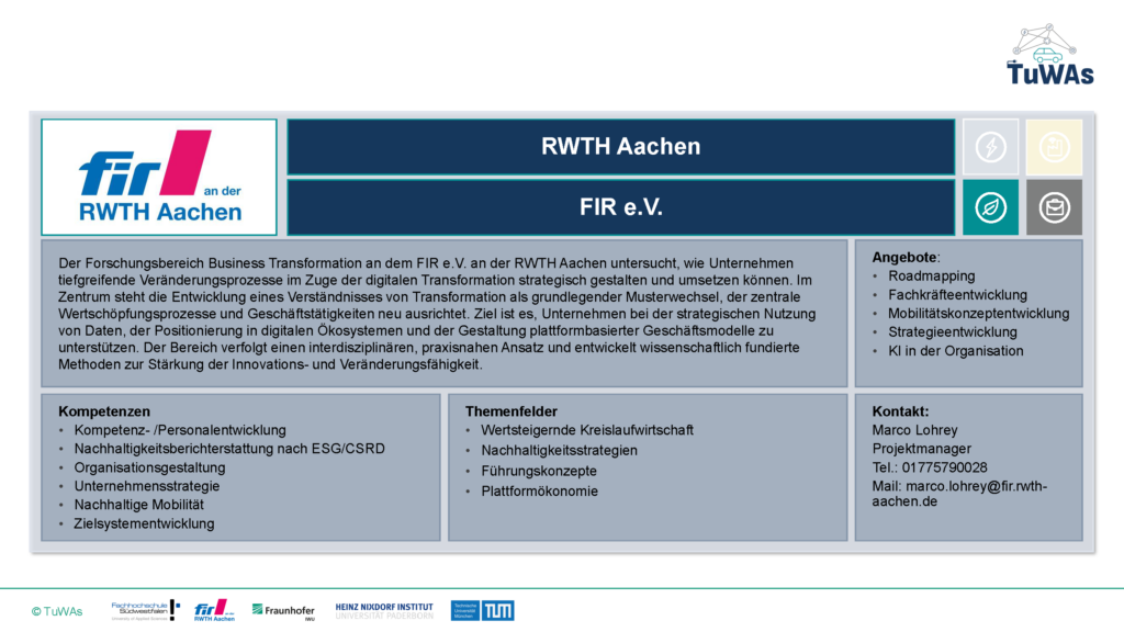 Die digitale Kompetenzlandkarte bietet einen Überblick über die fachlichen Schwerpunkte und Expertisen der am ‚TuWAs‘-Hub beteiligten Partner und Unternehmen aus der Automobilbranche. Über die interaktive Deutschlandkarte können Sie die einzelnen Organisationen kennenlernen, ihre Kompetenzen entdecken und direkt Kontakt aufnehmen.